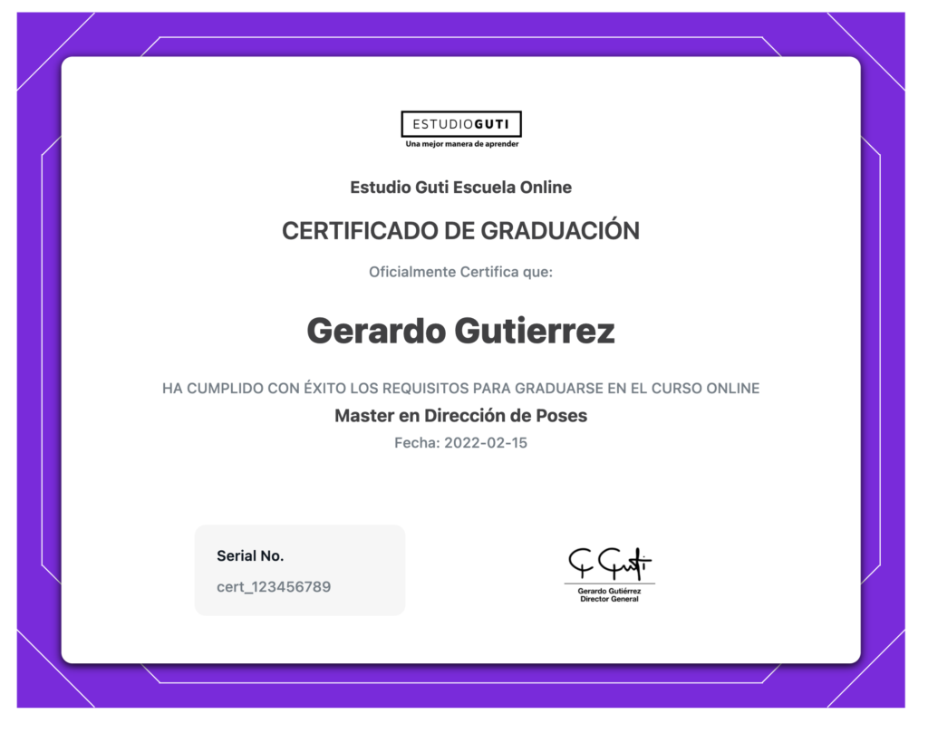 Finalmente estarás listo para tomar el examen donde repasarás los conocimientos obtenidos en el Master y así obtendrás tu diploma. Imprime tu diploma con orgullo y comparte tu logro con tus amigos y clientes ahora que ya dominas la dirección de poses mejor que el 99% de los fotógrafos en el mundo.